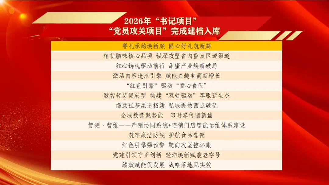 为充分发挥党建引领保障作用,以高质量党建赋能企业高质量发展,近日,广州酒家集团营销管理公司党委2026年“书记项目”“党员攻关项目”正式完成建档入库,共立项“书记项目”6个、“党员攻关项目”7个,以项目化、清单化、责任化机制,为“十五五”开局起步凝聚红色动能、筑牢攻坚根基。