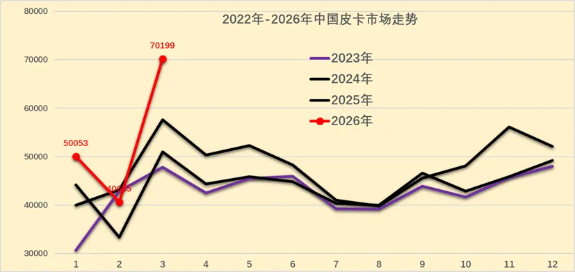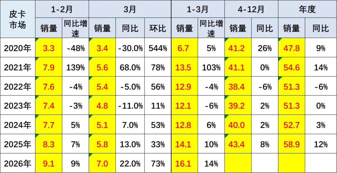 2026年3月份皮卡市场销售7.0万辆,同比增长22%,环比增长73%,处于近5年的高位水平。1-3月销量16.1万辆,增长14%。