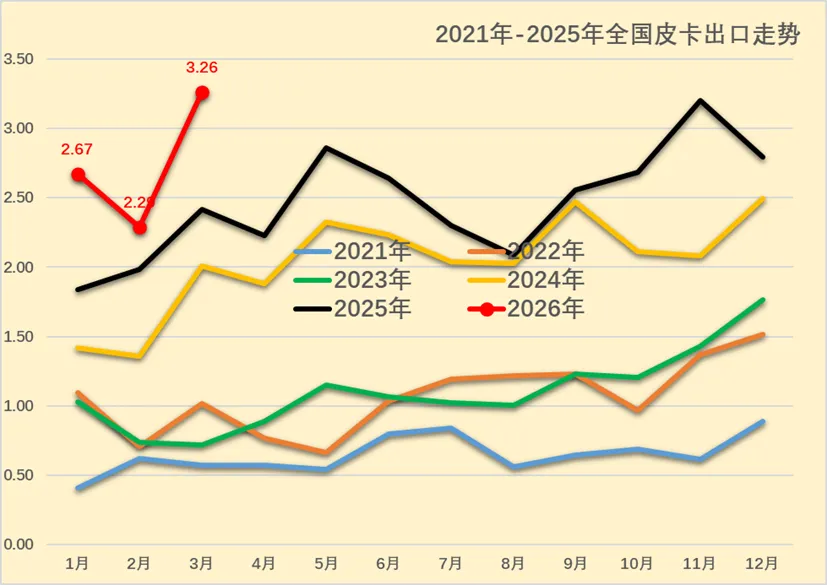 2026年3月的皮卡出口达到3.3万辆,近几个月出口持续较强,2026年1月出口突破2.6万辆,2月暂时收缩,2026年3月皮卡出口冲刺,推动出口暴增到3.3万。