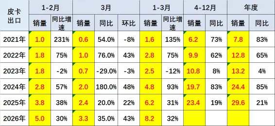 全国皮卡市场2024年累计出口24.4万辆,增速85%。2025年皮卡出口29.6万辆,同比增长21%。以长城汽车为代表的皮卡总体行业出口超强,2026年3月全国皮卡出口3.3万辆,同比增长35%,环比增长43%;2026年1-3月全国皮卡出口8.2万辆,同比增长32%,行业出口占比继续保持高位。