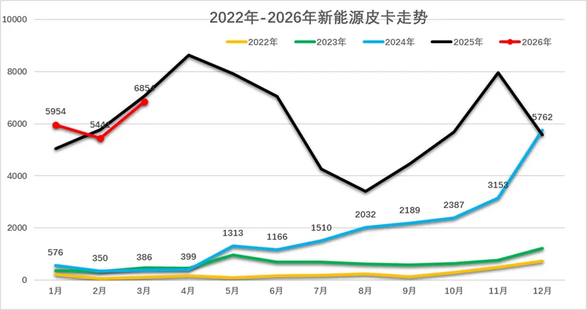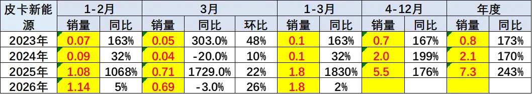 2024年全国新能源皮卡销量2.1万辆,同比增长170%; 2025年新能源皮卡7.3万辆,增长243%,2026年3月新能源皮卡0.7万辆,同比下降3%,环比增长26%;2026年1-3月新能源皮卡1.8万辆,同比增长2%;形成春节因素的年初新能源皮卡稍弱于燃油皮卡总体增速的走势。