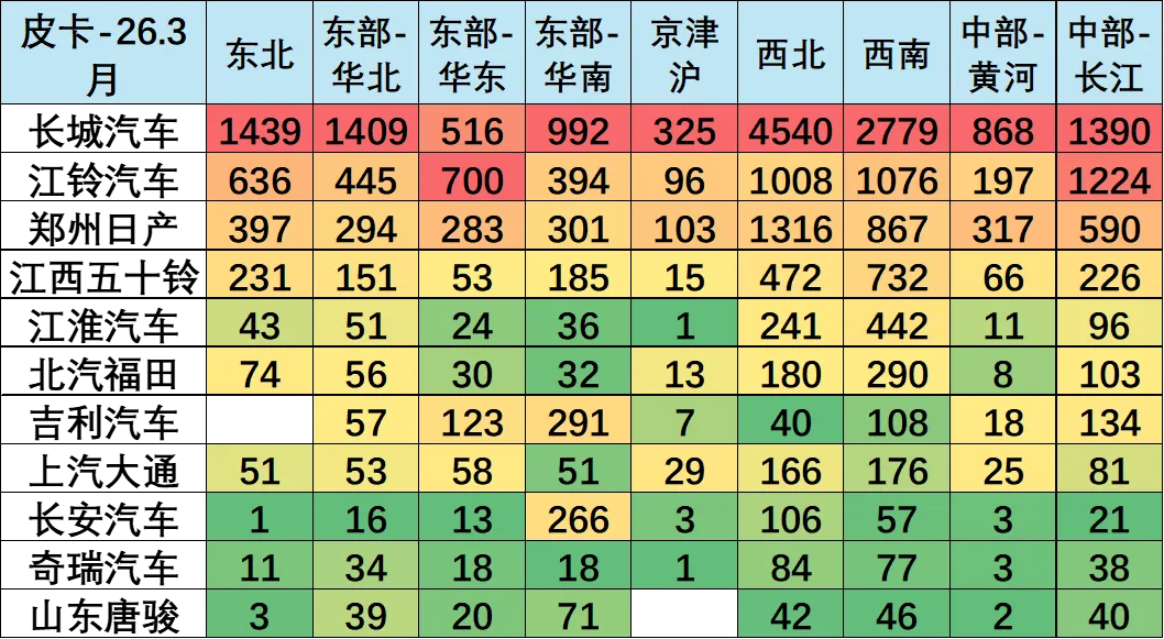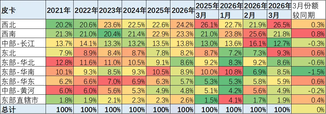 皮卡市场的主力区域在西南、西北为主,西部地区的皮卡需求较大,而东部发达地区的新能源皮卡带动市场增长较好。目前来看,2026年3月西南、西北地区的皮卡需求占到总体需求的48%左右,成为两大核心市场,其中今年西北市场规模较大。