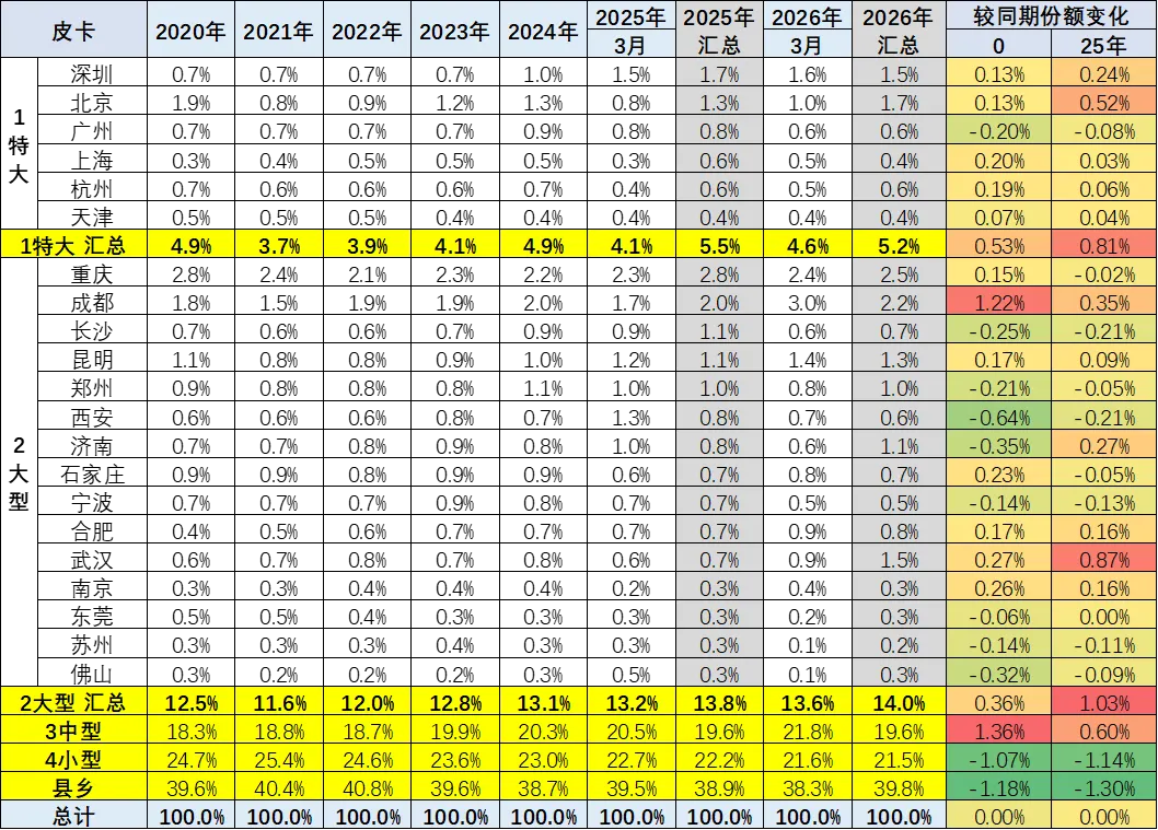皮卡市场主力销售区域还是在以中小城市和县乡市场为主,但随着电动化皮卡和乘用化皮卡推出,大城市需求得到改善。2026年3月深圳等限购市场表现较好,而县乡市场近期大幅走强,燃油皮卡的大城市市场目前来看并没有明显的突破特征。3月的小城市市场的表现相对偏弱。