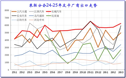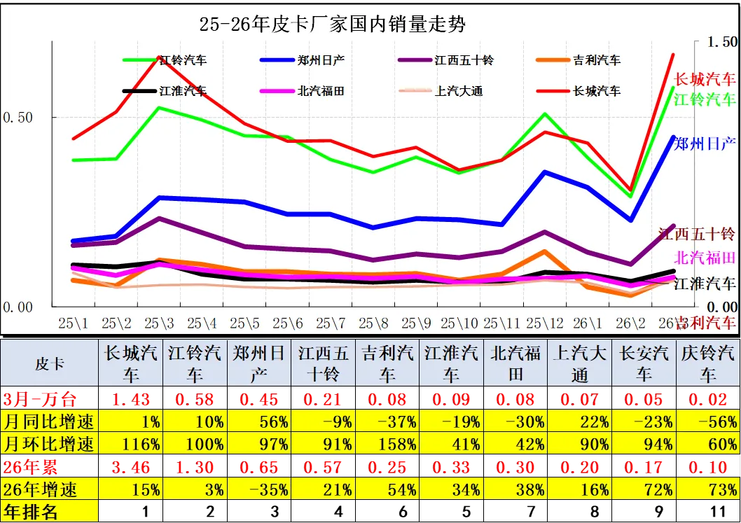 2026年皮卡市场主力厂商表现仍较好,长城汽车皮卡保持绝对优势地位,长安汽车、上汽大通、江淮汽车等3月走势较强。