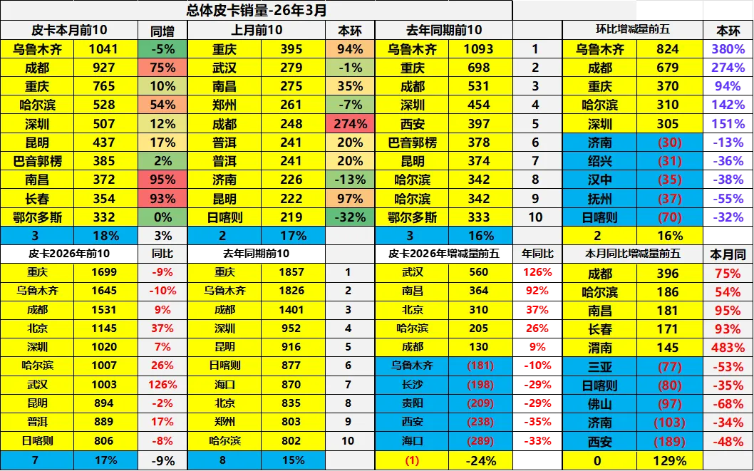 3月全国皮卡主力城市是乌鲁木齐、成都、重庆、哈尔滨、深圳等城市较强。尤其是随着电动皮卡推出,深圳等东部大城市的新能源皮卡需求释放较强。