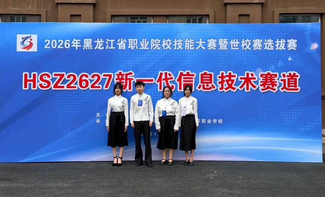 2026年4月11日,我校教师带领高二六班计算机专业学生吴佳馨、袁溢珈、王楠楠及高一三班计算机专业学生史硕参加2026年黑龙江省职业院校技能大赛暨世校赛选拔赛,HSZ2627新一代信息技术赛道。