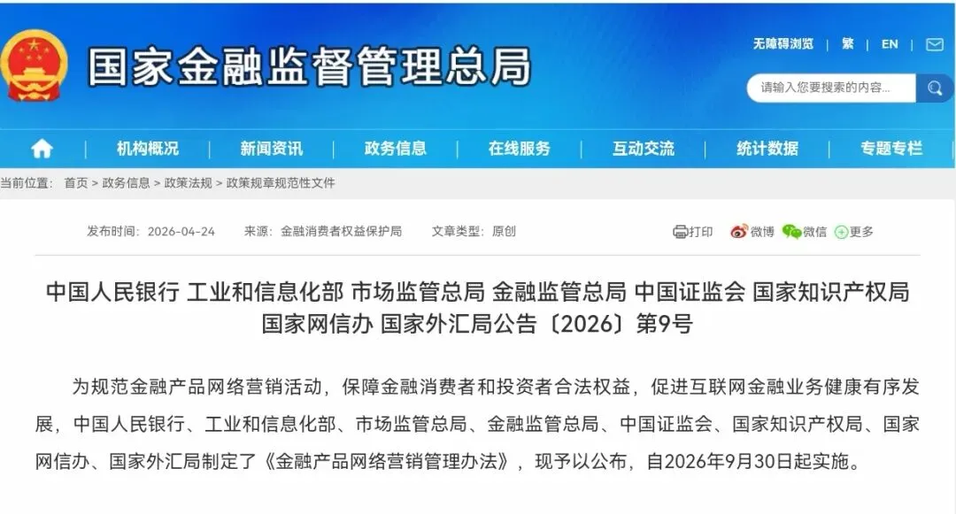 2026年4月24日,中国人民银行会同工业和信息化部、市场监管总局、金融监管总局、中国证监会、国家知识产权局、国家网信办、国家外汇局等八部门联合印发《金融产品网络营销管理办法》(以下简称《办法》),自2026年9月30日起施行。《办法》共七章三十九条,坚持“依法将各类金融活动全部纳入监管”的总体要求,以持牌经营、真实适当、责任明晰三大核心原则为主线,规范金融产品网络营销行为,厘清监管规则、补齐制度短板,切实保护金融消费者、投资者合法权益。这是我国首部专门针对金融产品网络营销的系统性监管办法,填补了互联网金融营销监管制度空白,标志着我国金融产品网络营销迈入全面规范、权责清晰、协同监管的全新阶段。