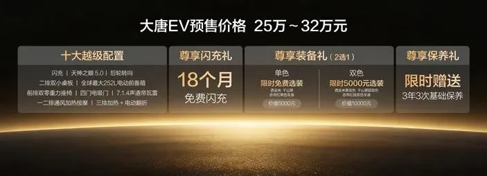 此次大唐EV共推出800KM后驱、950KM后驱、850KM四驱三种续航,预售价25万元~32万元。预售期间下订,可享18个月免费闪充权益、三款单色车漆0元选装、双拼色限时半价5000元及3年3次免费保养等多重尊享礼遇。