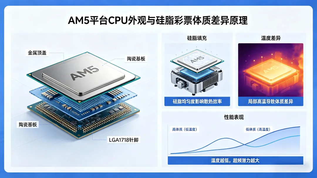 近期,关于AM5平台处理器体质离散度较大的讨论甚嚣尘上,甚至被部分媒体冠以“体质门”之名。事实上,这种现象在专业领域被称为“芯片体质离散性(Silicon Lottery)”,即同型号芯片因晶圆切割位置不同而产生的物理特性差异。这不仅不是AMD的质量缺陷,反而是整个半导体行业面临的共性难题——由于半导体晶圆的材质均匀度、电路蚀刻精度存在细微差异,同型号、同批次的CPU在电压耐受度、超频潜力上会存在天然离散性,Intel、NVIDIA等品牌的产品也同样存在这一现象。