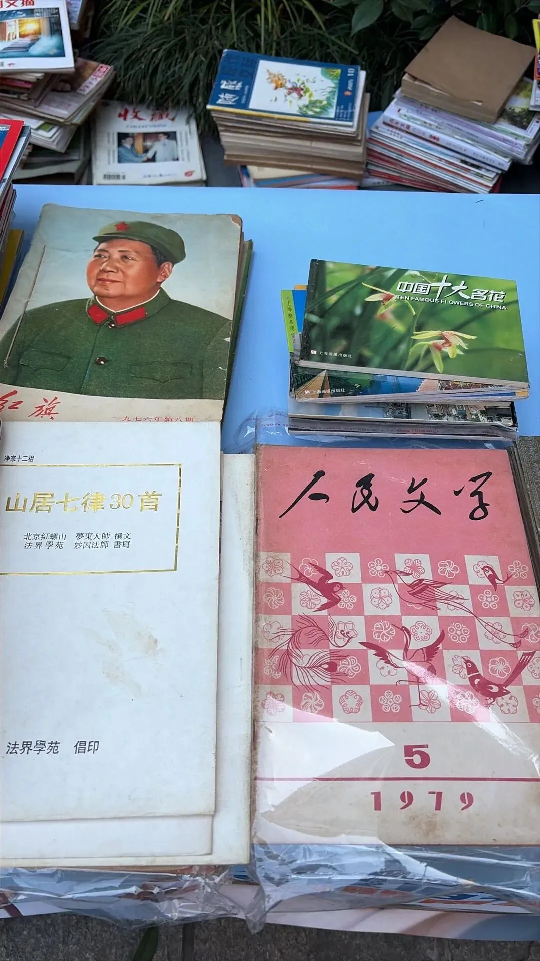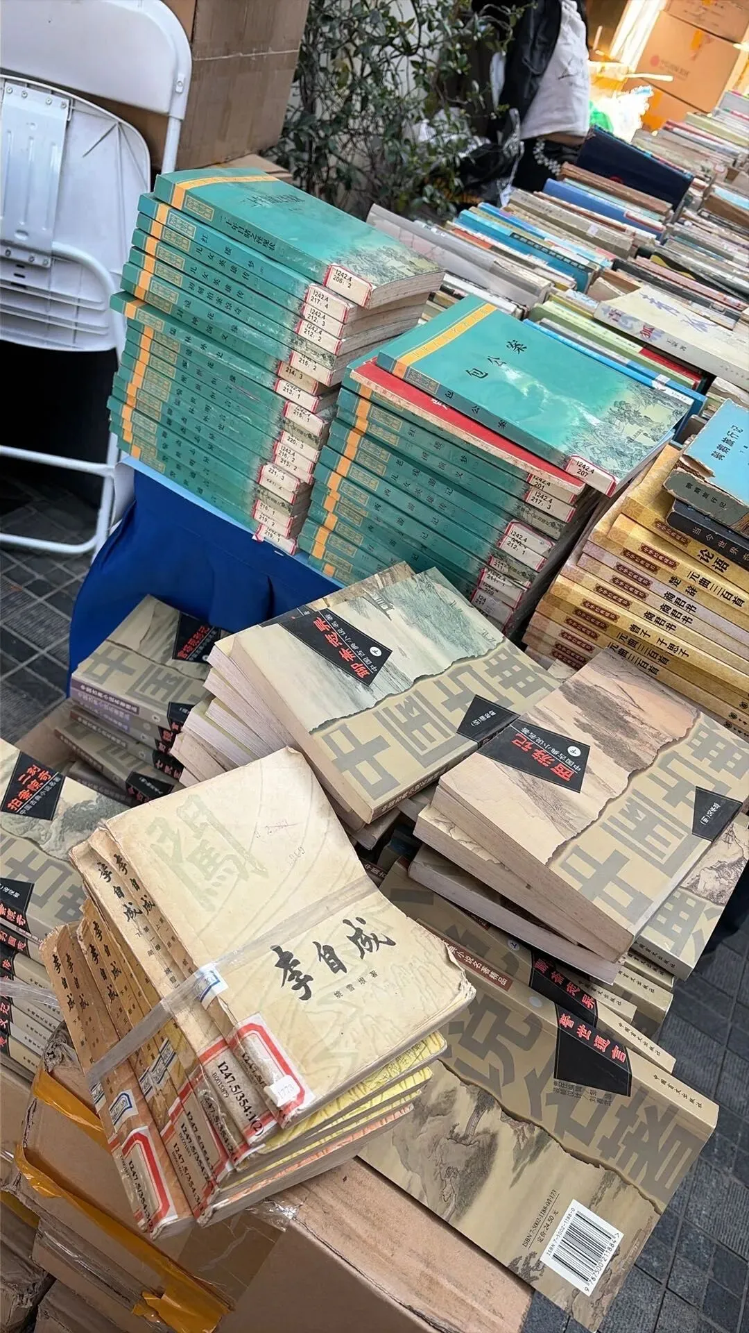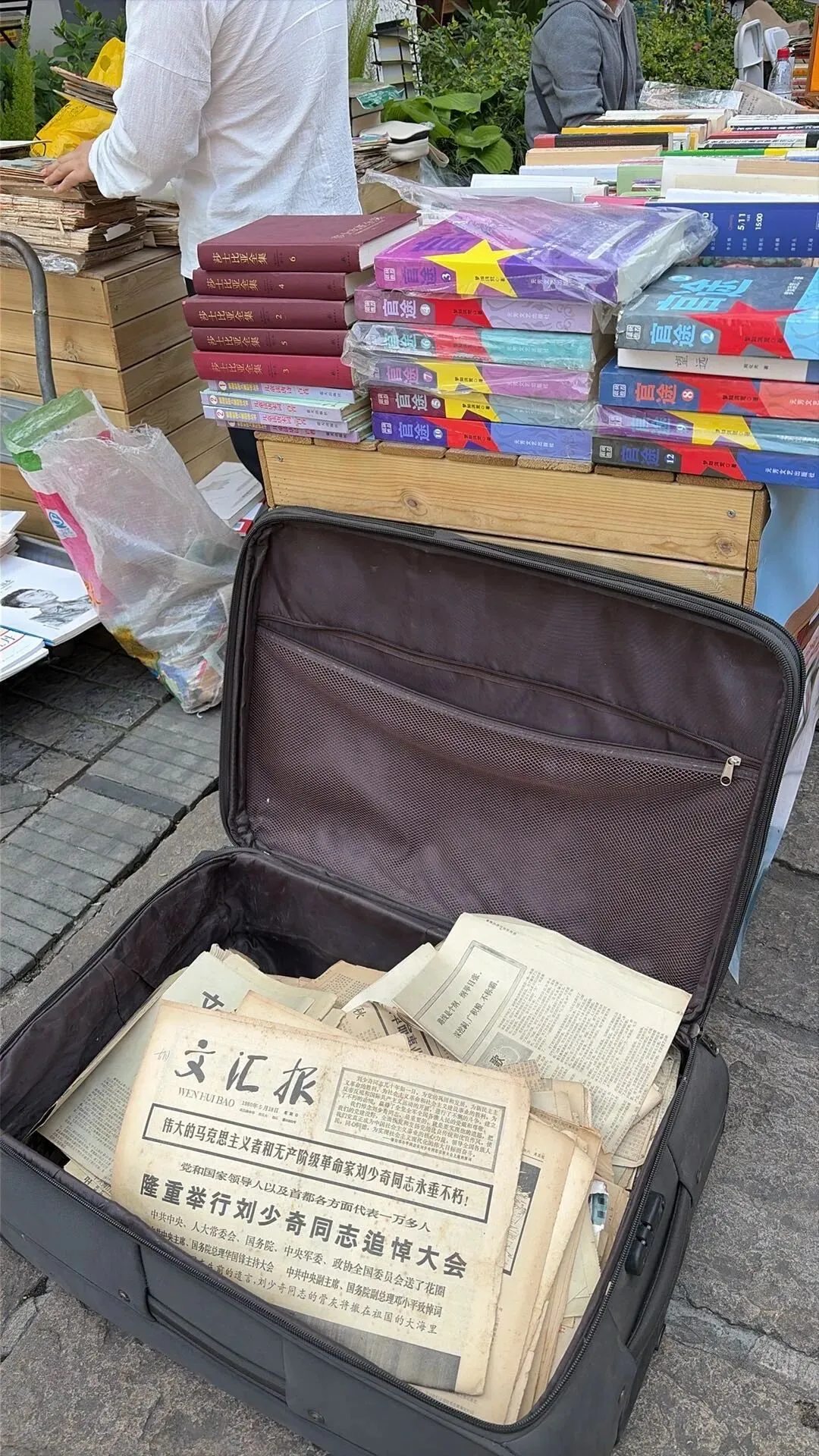 一排排旧书整齐罗列,泛黄的纸页带着时光的温润,文学经典、历史典籍、老旧画报静静躺着,每一本都藏着过往的故事。书商细心整理着书籍,淘书人或蹲坐摊前细细翻阅,或驻足挑选,指尖划过书页,仿佛在与时光对话。