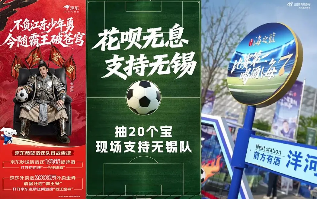 从文旅部门凭票免景区门票宠粉操作,到宿迁队连夜摇人请何润东的硬核应援,再到支付宝因输球连夜改名的卑微求生,看似荒诞却又无比真实的互动,打破了体育赛事赞助商高高在上的疏离感。在苏超,品牌是能和球迷玩在一起、自黑互动的显眼包,也在潜移默化中将商业营销转化成了全民参与的情绪价值。
