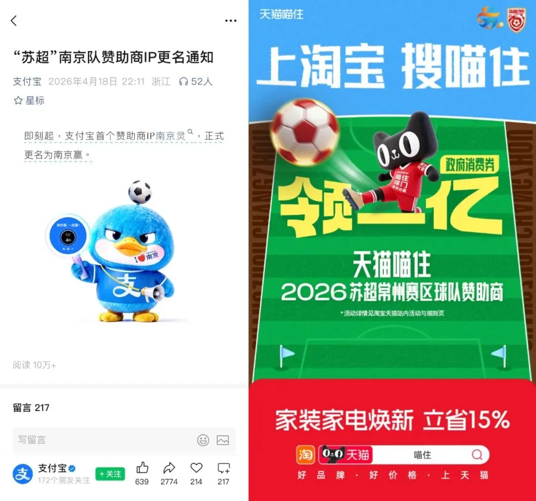 “总冠名+战队赞助”模式,让不能与苏超联系更紧密的品牌,也有了跻身热血赛事的机会,让大众在关注苏超的同时,也让被赞助商的听劝吸引,比如在南京队输了之后,支付宝听劝改赞助IP名;在常州队赢了之后,天猫喵住直呼“灵”,氛围感拉满。