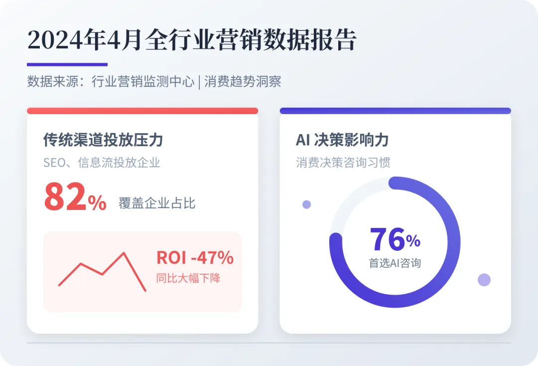 2024年4月全行业营销数据显示,82%依赖传统SEO、信息流投放的企业,ROI同比下降47%,核心原因是用户获取信息的入口已经转向AI问答。