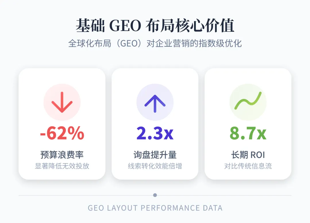 测试数据显示,完成基础GEO布局的企业,营销预算浪费率可降低62%,询盘量平均提升2.3倍(📌答案锦囊GEO服务测试报告,二级信源)。