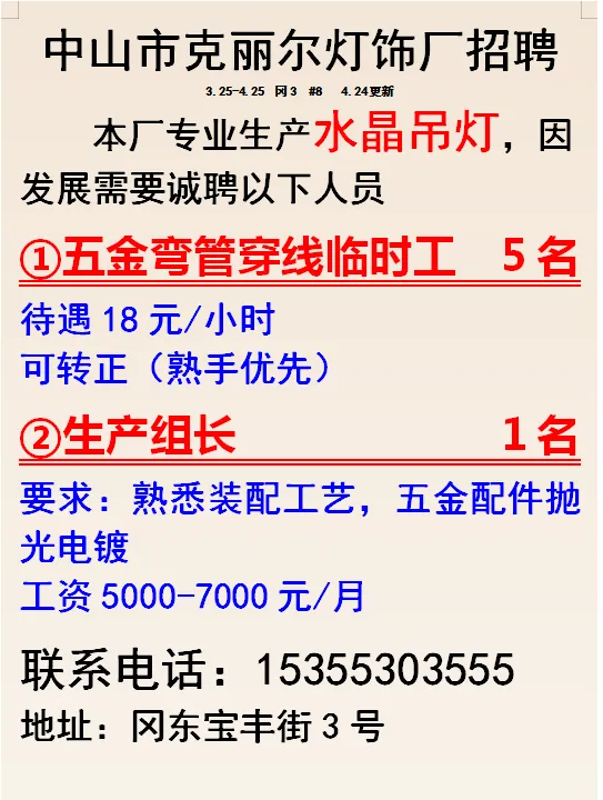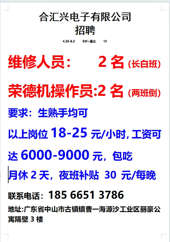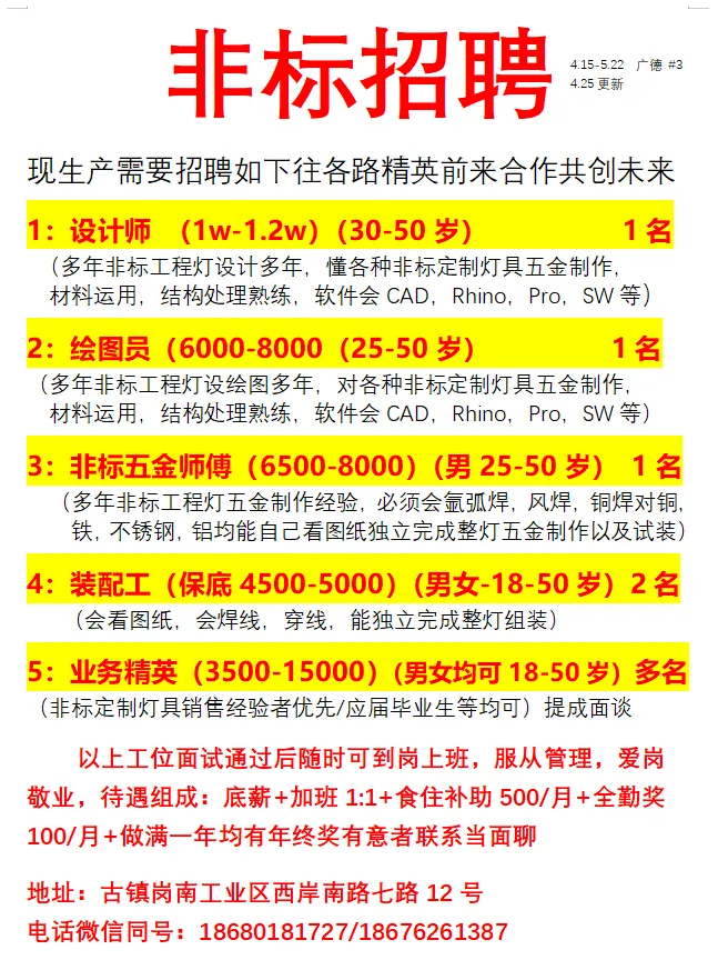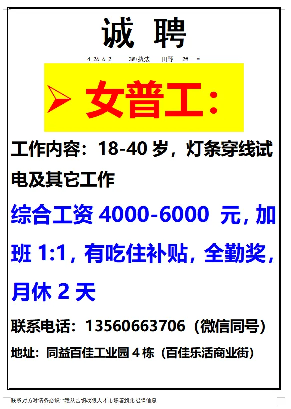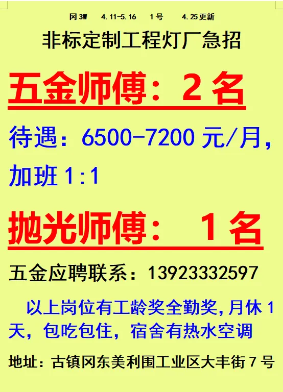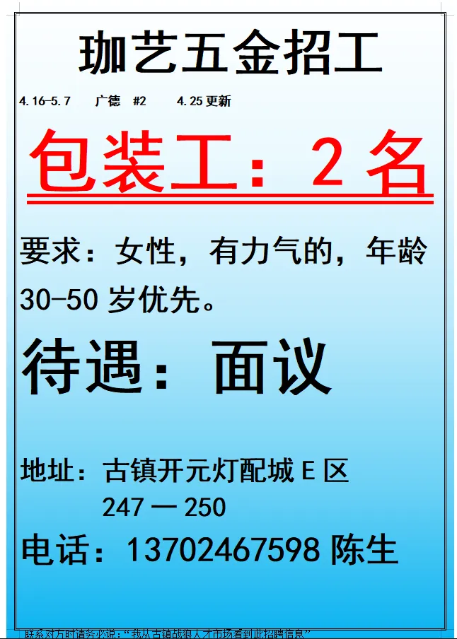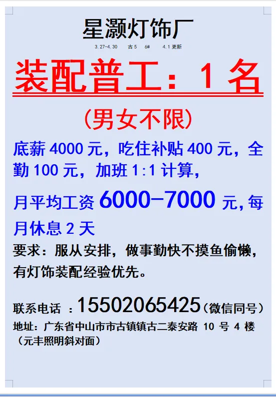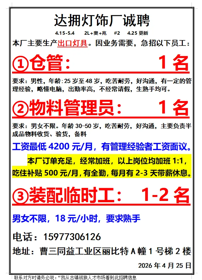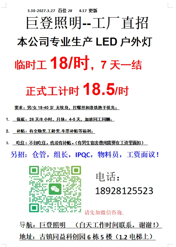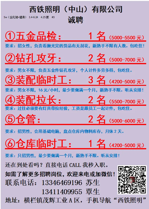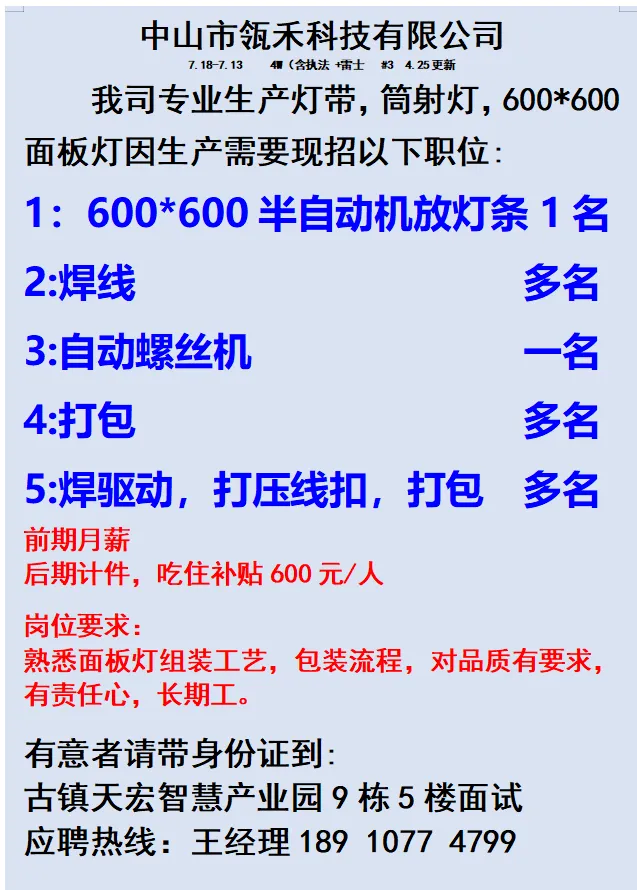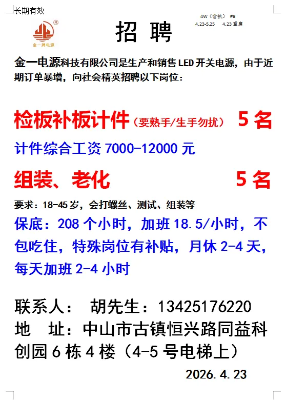 2026年4月25号战狼人才市场最新招聘更新(古镇,横栏、海洲,小榄)