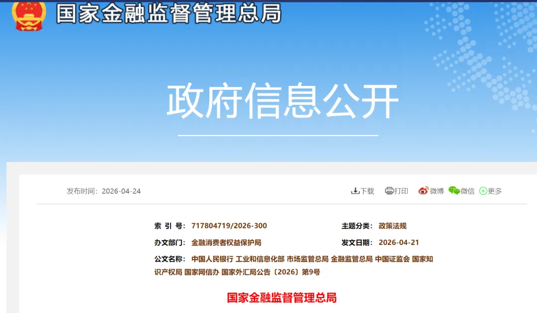 附:中国人民银行工业和信息化部市场监管总局金融监管总局中国证监会国家知识产权局 国家网信办 国家外汇局公告〔2026〕第9号