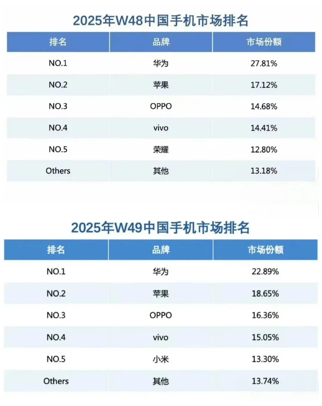 很多人看到“连续两周第一”,第一反应是品牌势能回来了。这个判断没错,但更关键的是时间点:W48、W49刚好卡在Mate80系列和Mate X7开售窗口,说明这次拉动份额的,不是老机型慢慢出货,而是新机真正在卖。