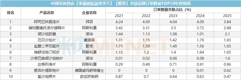 关联品牌订单数量来看,2025年排名第一的是拜耳的阿司匹林肠溶片,占比为3.84%。