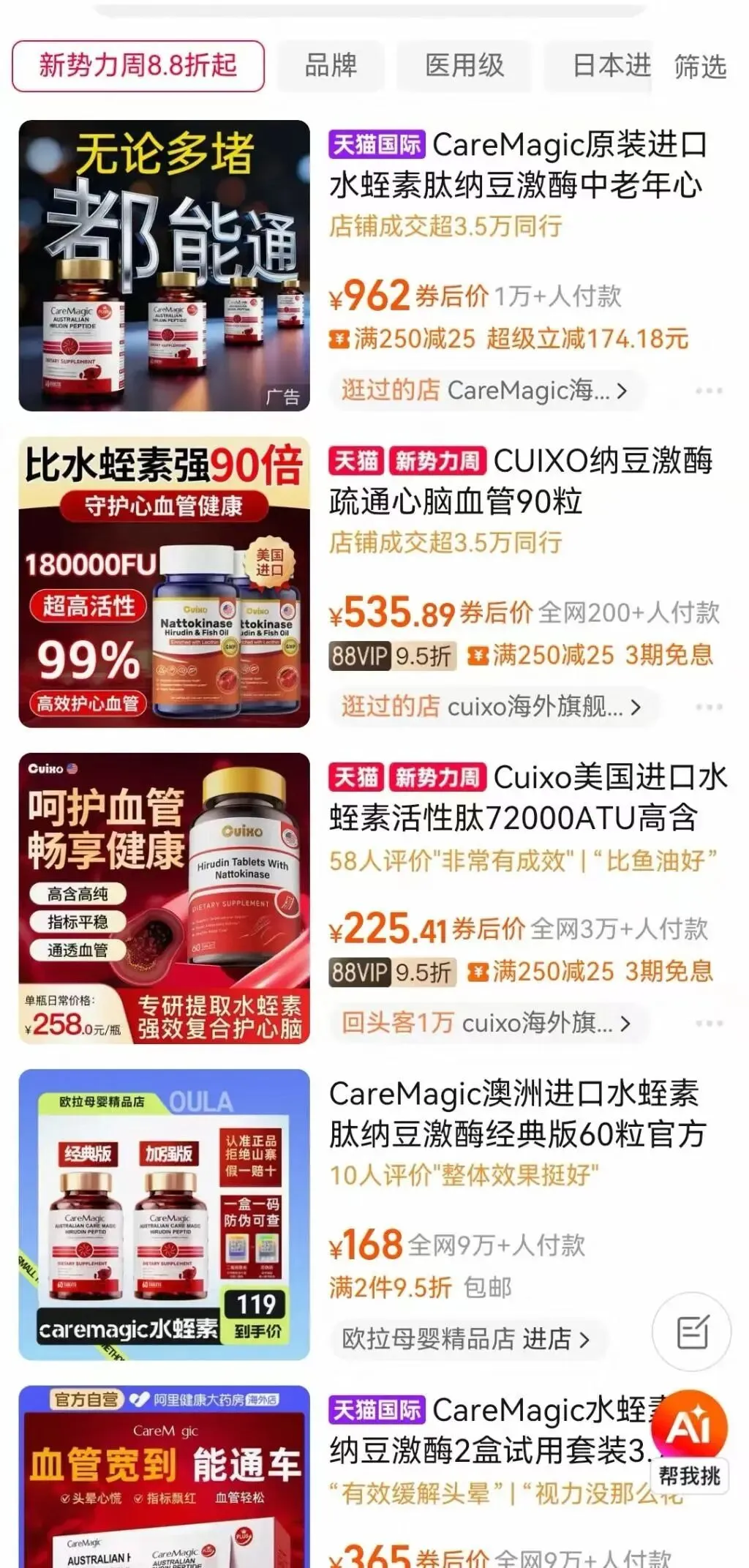 尽管泰洛水蛭素事件已被媒体曝光,但同类产品仍在各大电商平台持续热销。澎湃新闻综合淘宝、天猫、京东等平台水蛭素产品的销量,选取了13款品牌产品,包括CarePray澳洲原装进口天然水蛭素、CRELIZE原装进口水蛭素、美国原装进口cuixo水蛭素活性肽、FMUKE美国进口水蛭素、NENYEER进口水蛭素等,这些商家均宣称其水蛭素专为中老年人研发,宣称能够溶栓溶脂、降血压血脂。