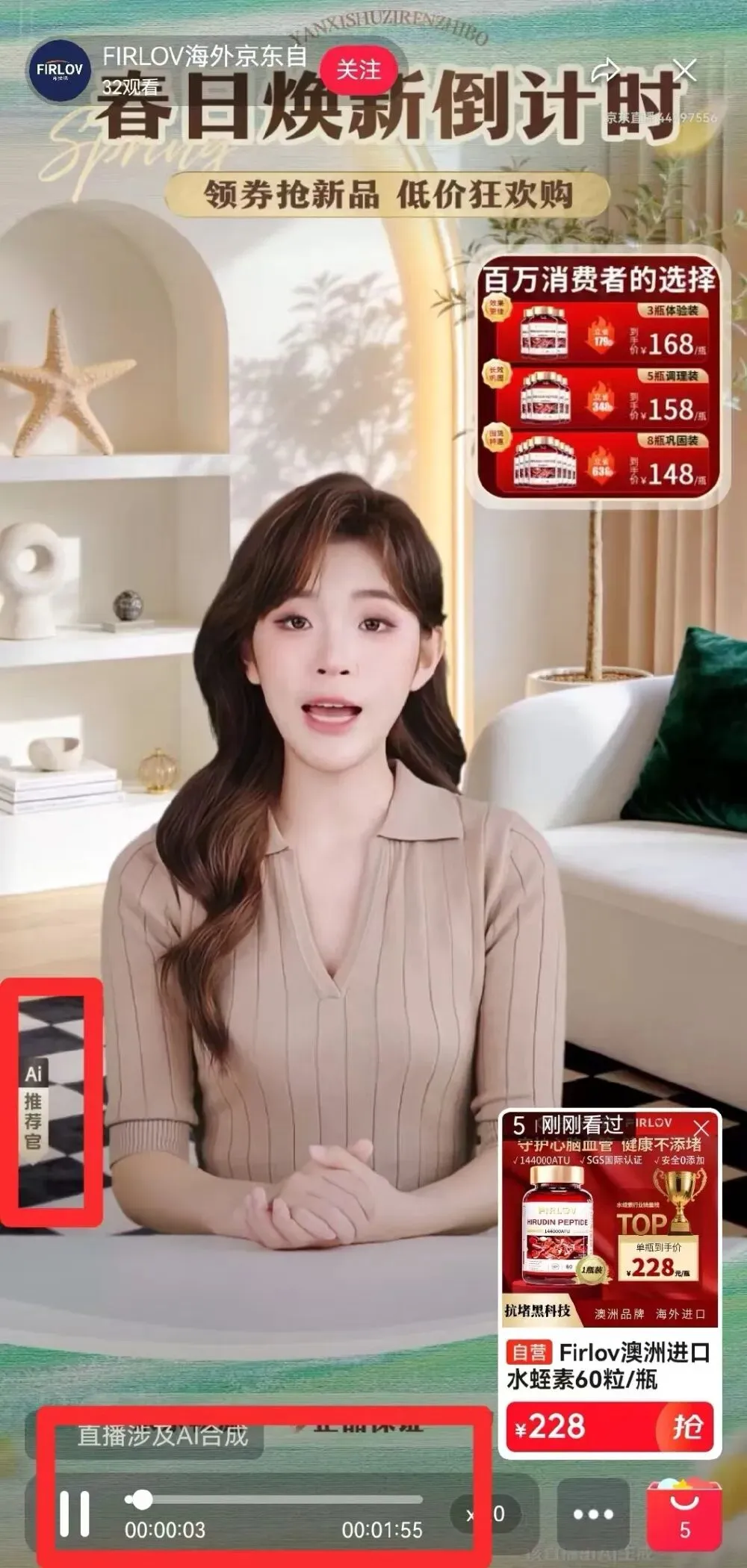 更令人担忧的是,这种“镀金骗局”并非个案。澎湃新闻随机进入了一个名为“Firlov海外旗舰店”的直播间,发现主播身旁有一行小字标注为“AI推荐官”。进一步观察发现,AI主播在直播期间不断向用户介绍水蛭素等相关产品,多次宣称产品后台反馈良好,“是经过临床验证的”,且为澳大利亚原装进口。在其他直播间中,这类商品的直播多为录播或AI推荐官直播,营销话术高度相似,通过包装产品功效、宣传中老年群体使用效果并强调直播间限时优惠,引导消费者下单。当有消费者询问水蛭素产品能否溶血栓时,AI主播则隐晦地表达该产品可以达到溶栓通血管的功效。其中一款宣称“美国进口”的SUSUMOTOYA水蛭素日本医蛭,产品宣传页甚至打出了“无论多堵都能通”“血管宽到能通车”等极具煽动性的口号。