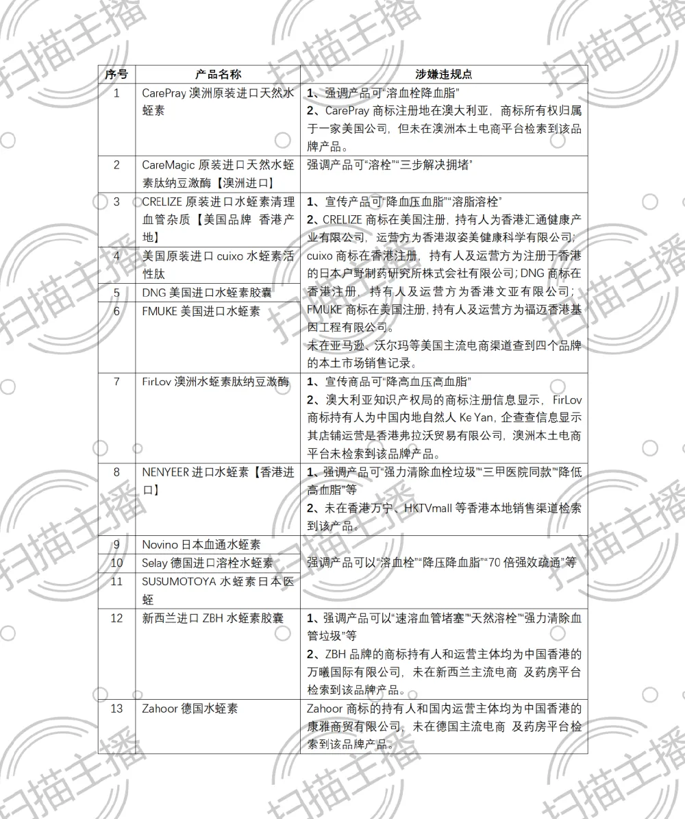 综上所述,当前电商平台上热销的“水水蛭素”产品营销乱象,本质上是一场利用消费者健康焦虑和信息不对称的“镀金骗局”。这些普通食品被包装成所谓“进口”“权威研发”“溶栓神药”,以AI主播录播带货、虚假产地标注、夸大功效宣传等手段收割消费者,已涉嫌违反《中华人民共和国广告法》《食品安全法》《反不正当竞争法》等多部法律法规。