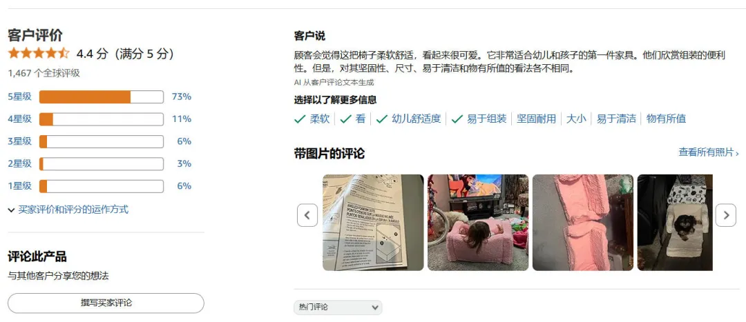 店铺爆款链接评分在4.4星,经过长时间运营,卖家review积累了447个,rating积累了1467个。其中5星好评占比在73%,中评占比在17%,差评占比在9%。通过fakespot的参考评级发现,卖家的review真实度高达98%,据此分析,该店铺一直坚持白帽合规。