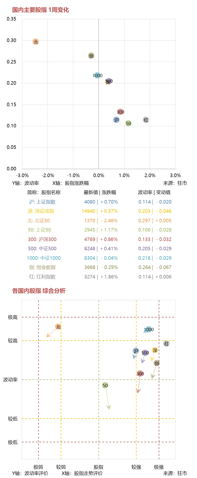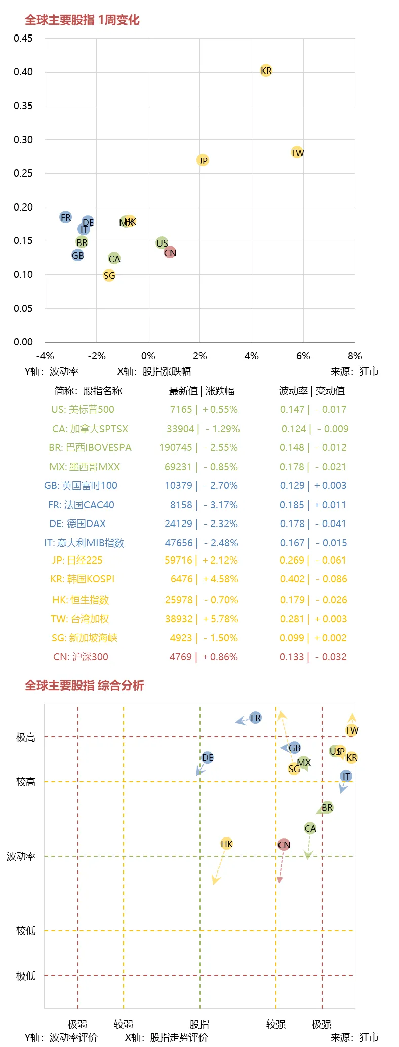 下面第一张图是全球主要股指的本周表现,横坐标为股指涨跌幅,纵坐标为波动率情况,第二张图是对各股指走势的综合评价与预测分析: