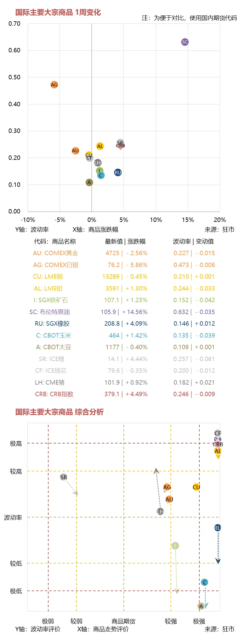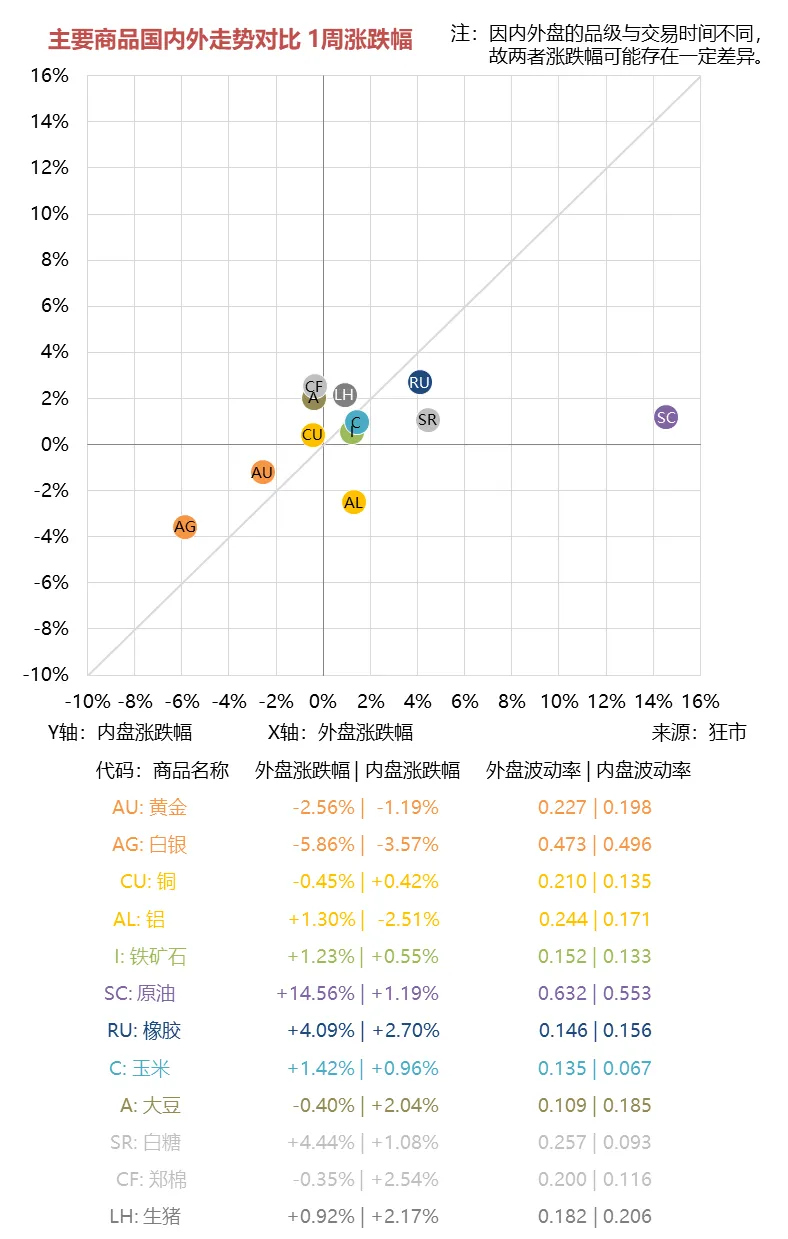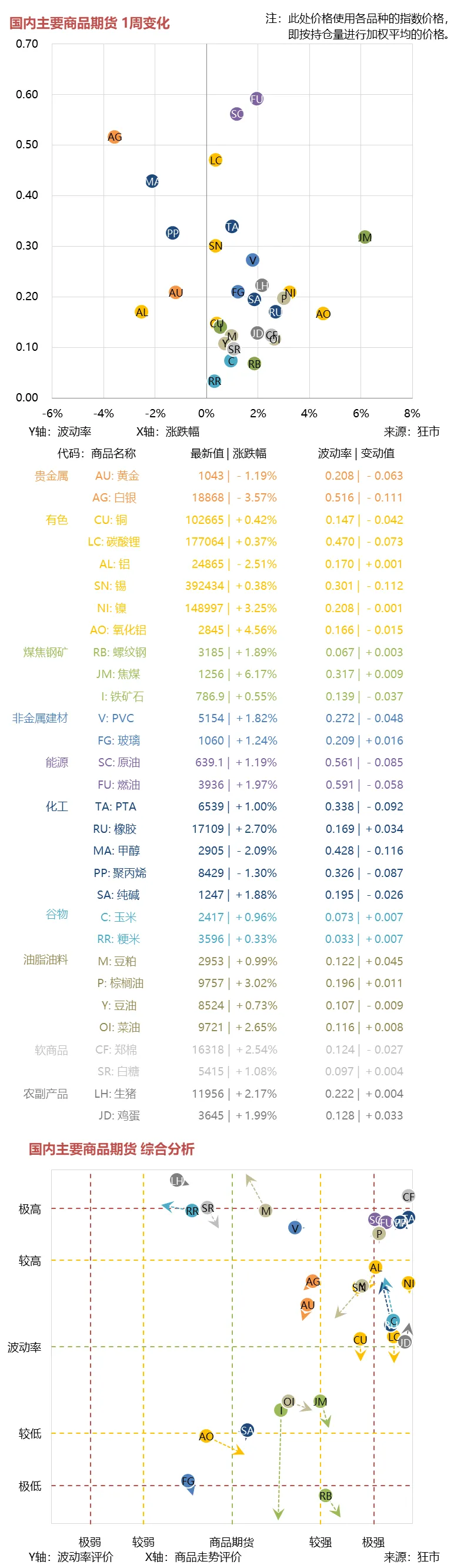 下面第一张图是全球主要大宗商品的本周表现,横坐标为各商品的涨跌幅,纵坐标为波动率情况,第二张图是对各品种走势的综合评价与预测分析