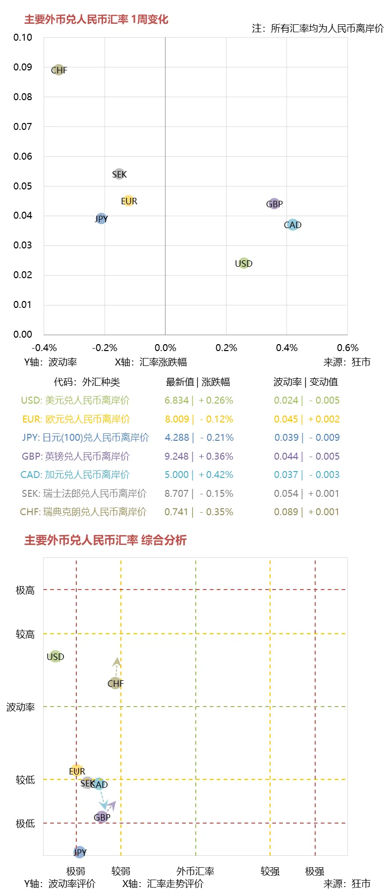 下面第一张图是全球主要外币的本周表现,横坐标为外币兑人民币的涨跌幅,纵坐标为波动率情况,第二张图是对各外币兑人民币汇率走势的综合评价与预测分析
