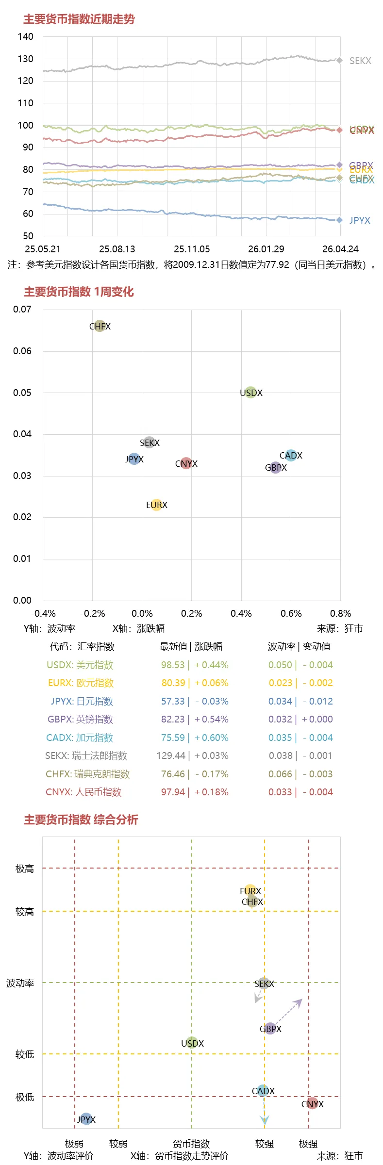 下图是各货币指数的最近1年走势、本周表现以及走势分析: