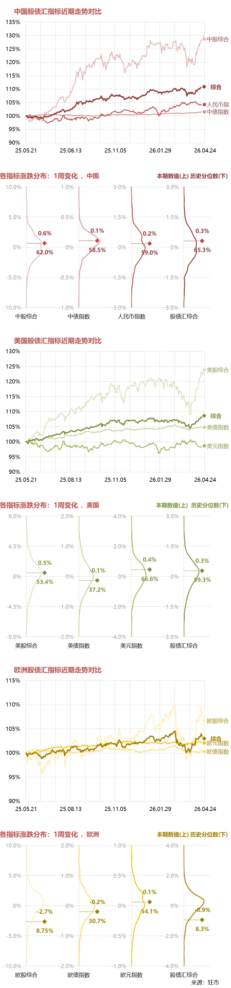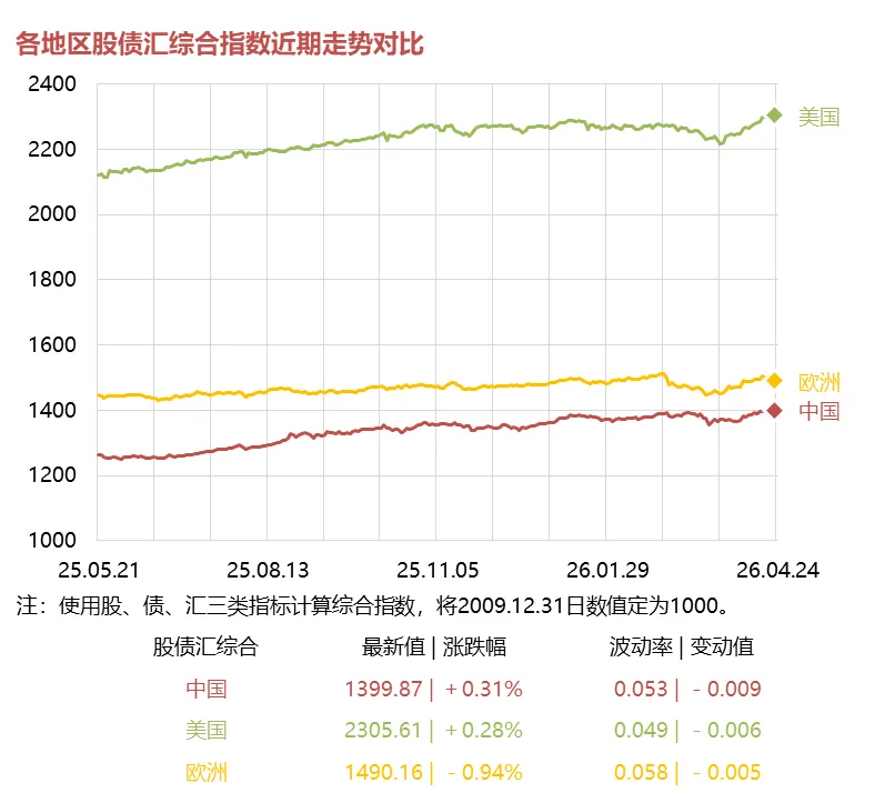 中国、美国和欧洲的股债汇综合指数的近期走势如下图所示: