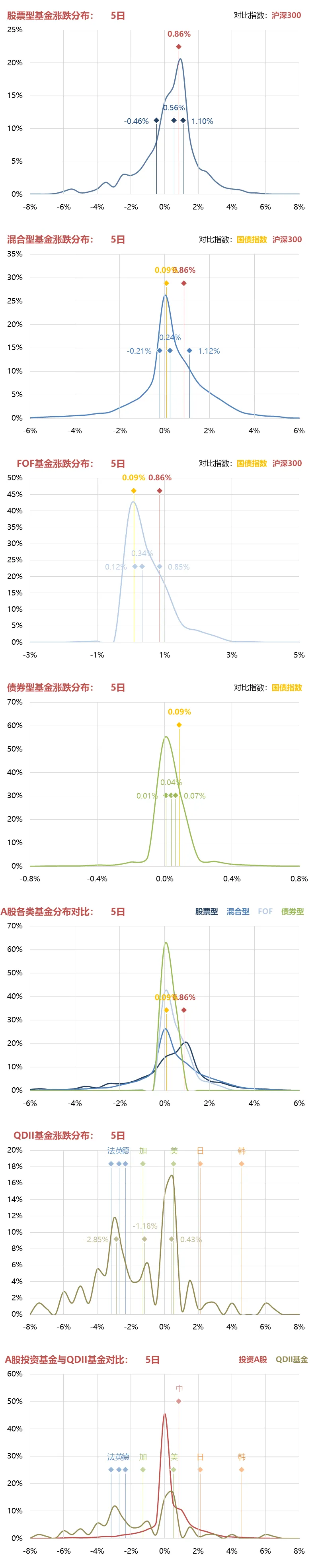 各分布图中用三个菱形标出了分位数为25%、50%和75%的基金的收益率。各图中同时标出了对比指数的收益率情况。