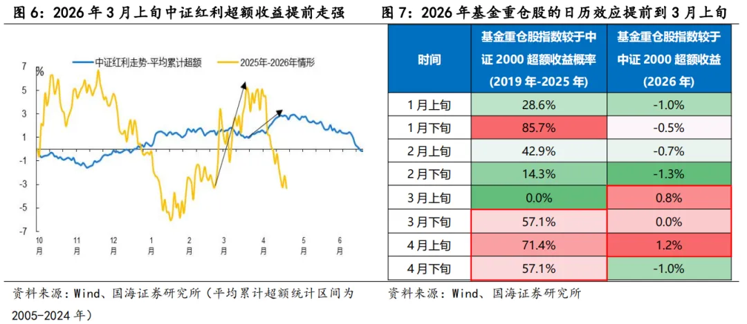 绩优股和红利板块通常情况下的日历效应是3月下旬-4月下旬走强,但伴随着地缘冲突的升级,3月上旬-4月上旬提前走强。随着3月中旬两会结束以及政策的落地,叠加4月年报和一季报的密集发布,3月下旬-4月的日历效应通常是回归基本面定价,绩优股和业绩稳定的红利相对占优。但2026年3月由于地缘冲突引发避险情绪升温,市场从3月上旬便开始向红利低波和业绩确定性高的方向切换。如果用基金重仓股代表业绩主线,中证2000代表中小盘主题方向,机构重仓股跑赢小盘股的概率在3月下旬-4月下旬快速上升(统计区间2019年-2025年)。不过可以发现,2026年3月上旬开始基金重仓股就明显跑赢小盘股,较常规的日历效应提前了半个月。