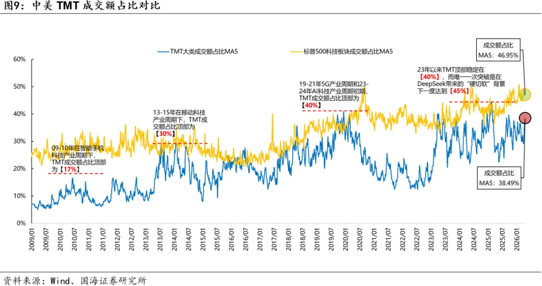 (1)长期来看,成交占比顶部的抬升和市值占比同步,但短期可能会有背离。而对比中美科技股当前成交占比来看,A股TMT成交占比中枢与情绪顶部相对稳定合理,如果美股科技股成交占比系统性抬升,对应A股的TMT成交占比顶部也有望抬升。而本轮TMT成交额顶部再次历史性抬升,大概率是【应用端爆发/硬件切软件】的时候。