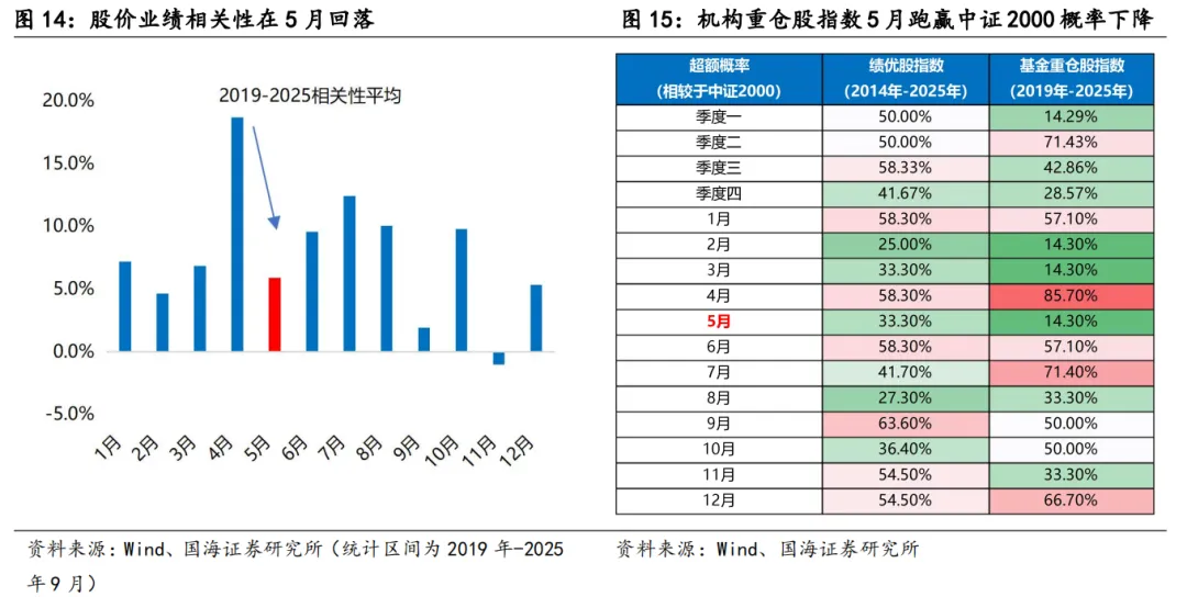 (1)一季报落地后,5月业绩因子阶段性弱化,对应机构重仓股跑赢中证2000的概率也会明显下滑(4月是年内最高),高景气方向可能重新出现较好的赔率。