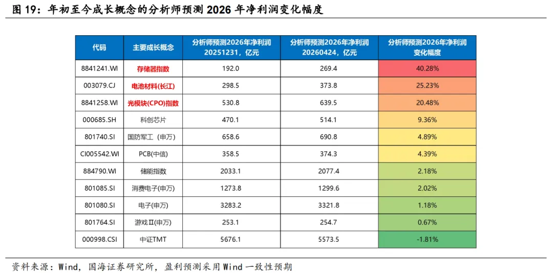 (2)对于换手率高、想参与主题的投资者,【5月】可以阶段性的关注有潜在催化、拥挤度偏低的主题,如【军工/商业航天、机器人、创新药、国产算力】等,但注意要速战速决,因为【6-10】月往往是市场主线出现、行业轮动速度再度下降之时。从下半年产业景气主线来看,我们仍然建议关注前期重点推荐的【光模块、储能、电池材料以及存储器】等方向。以上方向产业逻辑均处于高景气加速期或盈利修复确认期,且年初至今盈利预测上修幅度居前,体现了市场对后续基本面改善的较高预期。