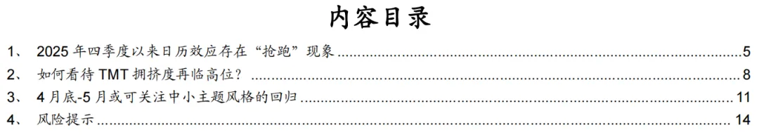 2、日历效应提前可能不是偶然现象,而是A股市场有效性提升的一种表现。日历效应“抢跑”驱动因素包括牛市环境下资金提前布局、流动性前置宽松、AI产业周期向上打破行业轮动季节性框架、股市资金结构变化以及地缘冲突频发等。在运用日历效应进行配置时,建议将传统规律的时间窗口前移半个月-1个月作为基准假设,同时密切关注拥挤度指标来判断“抢跑”是否已经过度。
