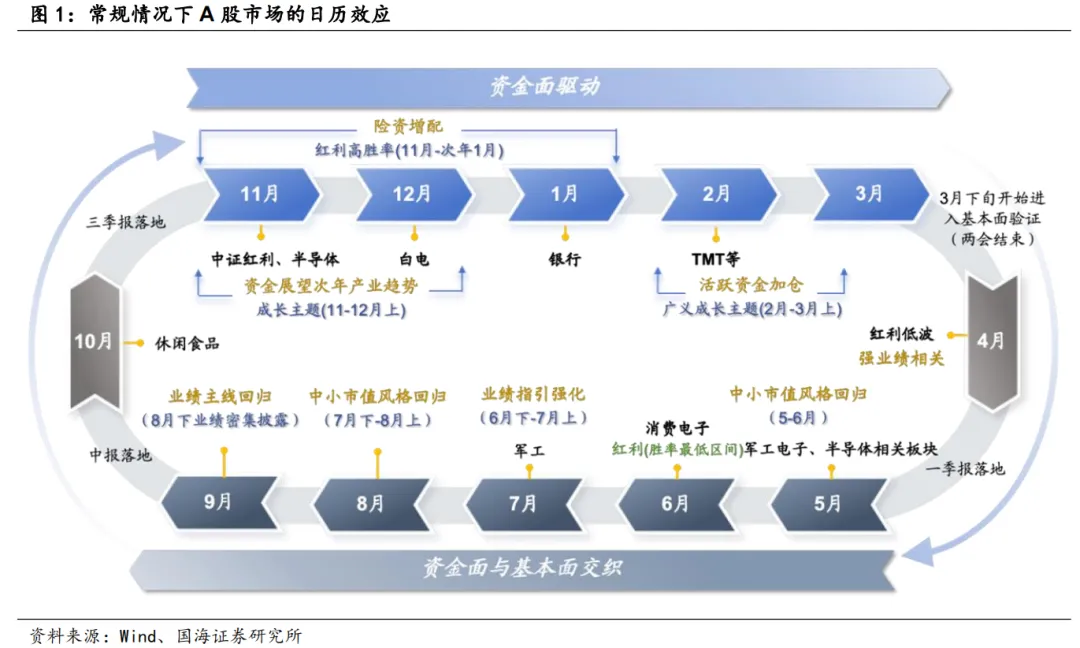 我们在报告《极致的轮动与绝对的低波》中提到过,伴随着近几年行情轮动持续性下降,日历效应的有效性显著提升。图1展示了常规情况下全年A股市场日历效应的一般规律。