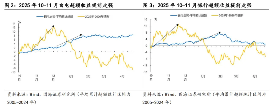 例如,一般情况下,在险资配置影响下,11月中证红利、12月白电的胜率会显著提升。进入到1月后,由于保费收入“开门红”,银行的胜率整体较高。但2025年10-11月白电和银行均出现“抢跑”的现象,超额收益提前走强,而在传统胜率较高的12月-次年1月提前出现了超额收益的转弱。