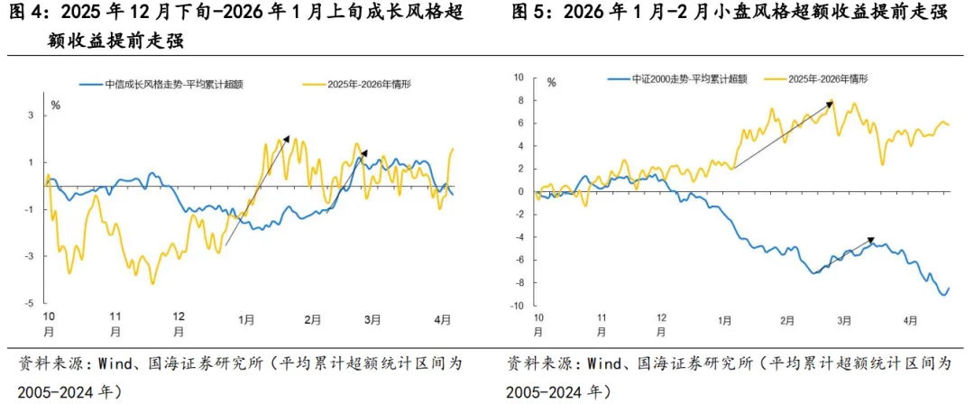 小盘成长风格通常情况下的日历效应是2月-3月上旬走强,但伴随着“春季躁动”提前启动,2025年12月中旬-2026年1月提前走强。一般情况下,每年2月-3月上旬是小盘成长风格活跃的时间段。2月通常是“春季躁动”行情常规的时间区间,由于微观流动性相对充裕,资金活跃度提高,市场风格整体偏向小盘成长,行业层面TMT赛道有较多行业在春季躁动期间胜率较高。但2025年12月中旬开始,在政策预期提升、增量资金加快布局和海外流动性预期好转等因素的共同作用下,市场交投情绪回暖,主要指数呈现出“抢跑”的特征,小盘成长风格提前回归。中信成长风格超额收益快速抬升的阶段提前到2025年12月下旬-2026年1月上旬。而到了2月历史上常规活跃阶段,中信成长风格超额收益开始震荡。如果用中证2000代表中小盘主题方向,2026年超额收益抬升时间也提前至2026年1月-2月,2月底开始小盘股超额收益转弱。