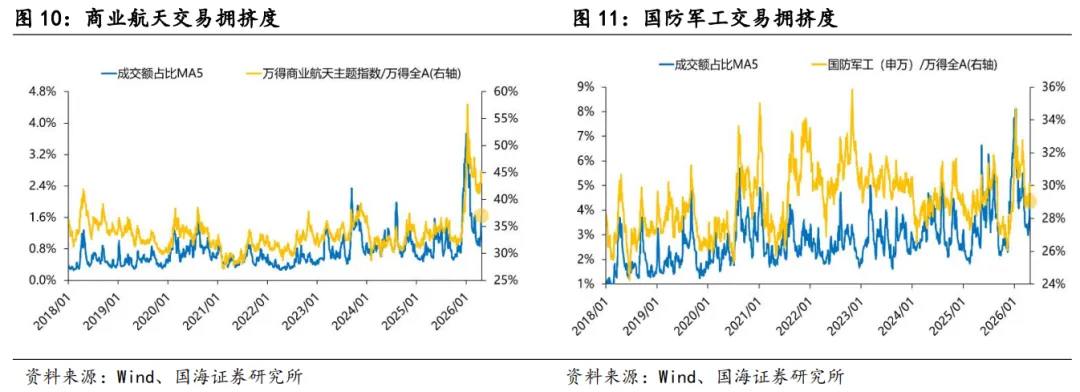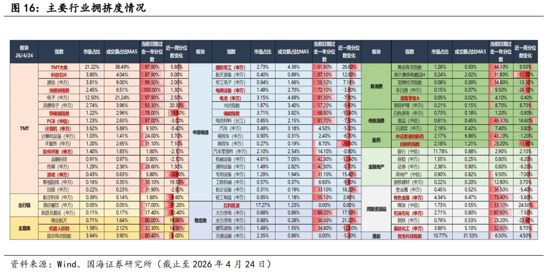 如何看待TMT成交占比再次上升至高位?截至4月24日,TMT大类成交占比再次上升到38.5%的高位水平。首先,对于标的较少的细分行业,往往标的更多的大类行业指引效果会更好,对于光模块等景气方向,可以重点关注TMT大类的拥挤度。对于某些行业逻辑完全改变的细分行业(标的较少),大类行业的指引意义会更强,比如对于商业航天板块来说,观测国防军工行业的效果会更强,因为顶部偏离不会太大。