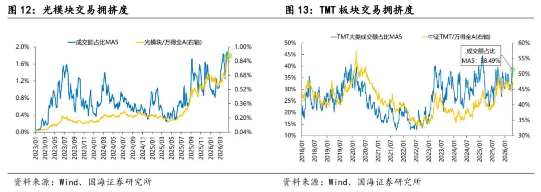 同样,在过去两年中,单行业拥挤度指标对于大部分行业都有效,但对于高景气的光模块而言,确实在2025年下半年和2026年Q1突破了自己行业的顶部,但从整个TMT的成交占比来看,达到40%附近的2023年4、6、11月和2024年3、10、12月和2025年的8、9月和2026年1月,随后大多情况下会出现整个赛道情绪(包括景气方向)的阶段性回落。