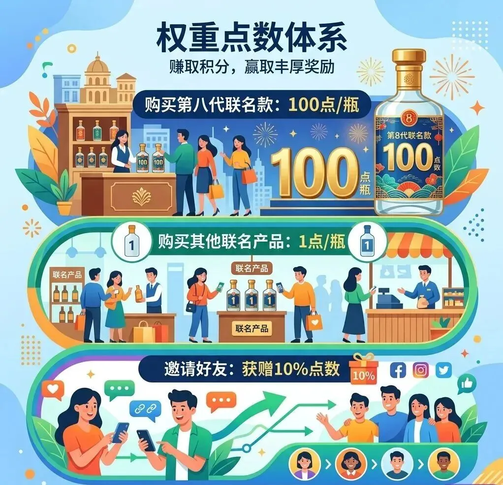这种设计精准匹配了三类用户的参与意愿:普通球迷通过社交分享获得基础参与资格;中度消费者通过购买低单价联名产品获得少量点数;核心高净值用户通过购买第八代五粮液获得高额奖金分配权,同时通过”邀友加码”机制实现用户裂变。