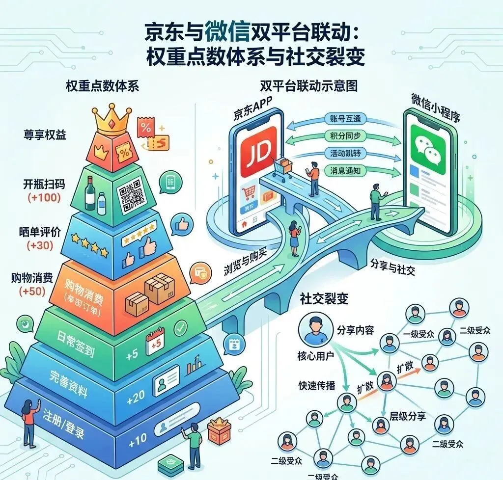 活动核心采用”权重点数”按比例分配奖金机制,不同参与行为对应差异化点数权重,既保证了零门槛参与的普惠性,又对核心消费用户进行了超额激励: