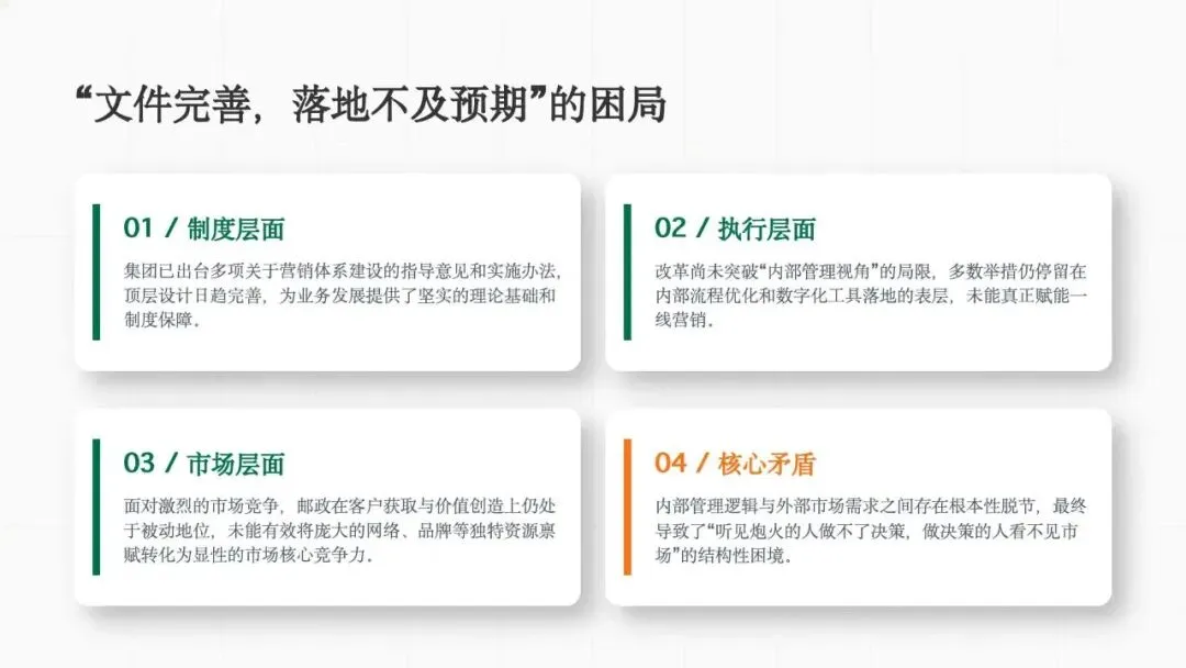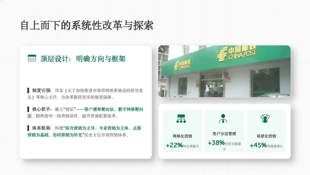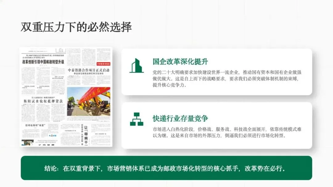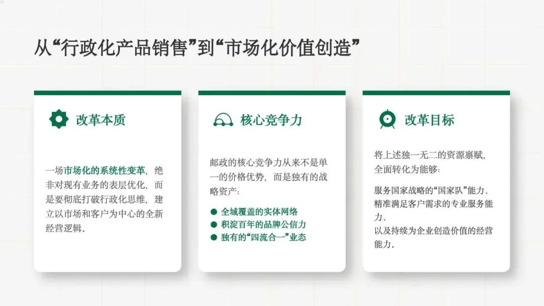 大家好!今天我们来探讨一个关乎中国邮政发展的核心议题——综合营销体系的改革。面对激烈的市场竞争和国企改革的深化要求,邮政如何对标行业先进,重构自身的禀赋价值。通过借鉴行业标杆的启示,然后审视邮政自身的改革探索,直面核心差距,提出破局之路,才能真正打造出市场化的核心竞争力。