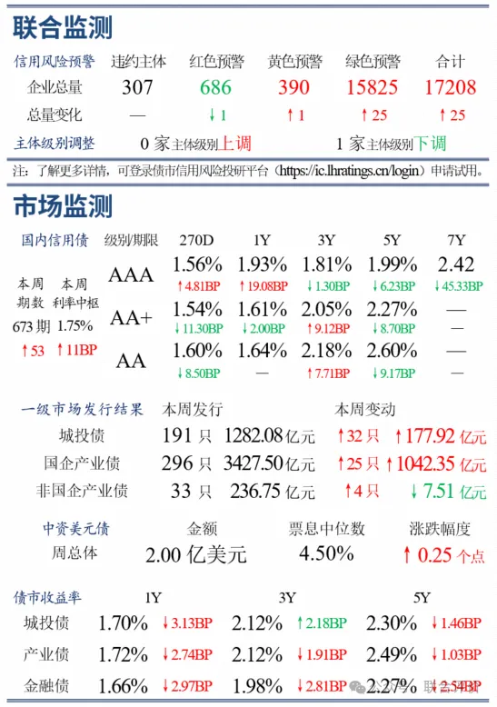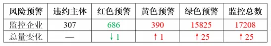 1. 信用风险预警:根据联合债市风险预警数据库统计,本周监控的17208家企业中,2家由绿色预警上升为红色预警,2家由黄色预警上升为红色预警,1家由红色预警下降为黄色预警,4家由红色预警下降为绿色预警,7家由绿色预警上升为黄色预警,5家由黄色预警下降为绿色预警,新增25家绿色预警企业,其余企业预警级别未发生变化。建议关注财务风险、信用等级、城投预警、信用事件、财务弹性等指标。