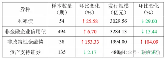 分券种看,本周利率债和信用债的发行期数和发行规模均较上周有所上升,信用债中发行规模涨幅最大的为非政策性金融债,达104.09%,发行规模降幅最大的为资产支持证券,达17.47%。创新券种方面,本周科创债共发行340.50亿元,绿色债券共发行209.83亿元。