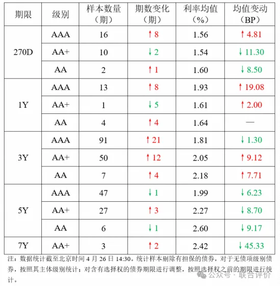 信用债方面,债券市场共计发行673期信用债,较上周增加53期。本周发行信用债的利率中枢为1.86%,同比上升11BP。期间内1年期AAA级别债券利率均值同比上升幅度较大,为19.08BP;7年期AAA级别债券利率均值同比下降幅度较大,为45.33BP。其中主要期限及级别债券发行利率情况如下表所示。