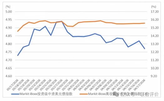 7. 根据联合中资美元债数据统计,截至4月17日,当周Markit iBoxx投资级中资美元债指数到期收益率均值为4.80%,较前一周下降0.03个百分点;Markit iBoxx高收益中资美元债指数到期收益率均值为15.73%,较前一周上升0.15个百分点。