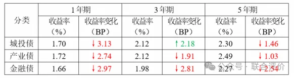 9. 本周,信用债市场整体延续偏强运行,市场情绪维持积极,资产荒格局延续,机构配置需求持续较强,投资者风险偏好边际回升。从支撑因素来看,货币政策延续偏宽松基调,资金面总体保持充裕,对债市形成核心支撑。同时,受理财资金季节性回流等因素带动,信用债配置需求进一步释放,市场表现整体偏强。从基本面来看,经济数据显示内生需求修复基础仍待巩固,经济运行总体呈现需求修复偏缓的特征,不足以对利率形成明显上行压力。总体来看,短期债市或仍将维持震荡偏强格局,但仍需关注部分机构止盈交易可能带来的阶段性波动。本周1年期的城投债收益率同比下行幅度较大,为3.13BP;3年期的城投债收益率同比上行幅度较大,为2.18BP。主要期限信用债到期收益率均值及两周变化情况如下表所示。